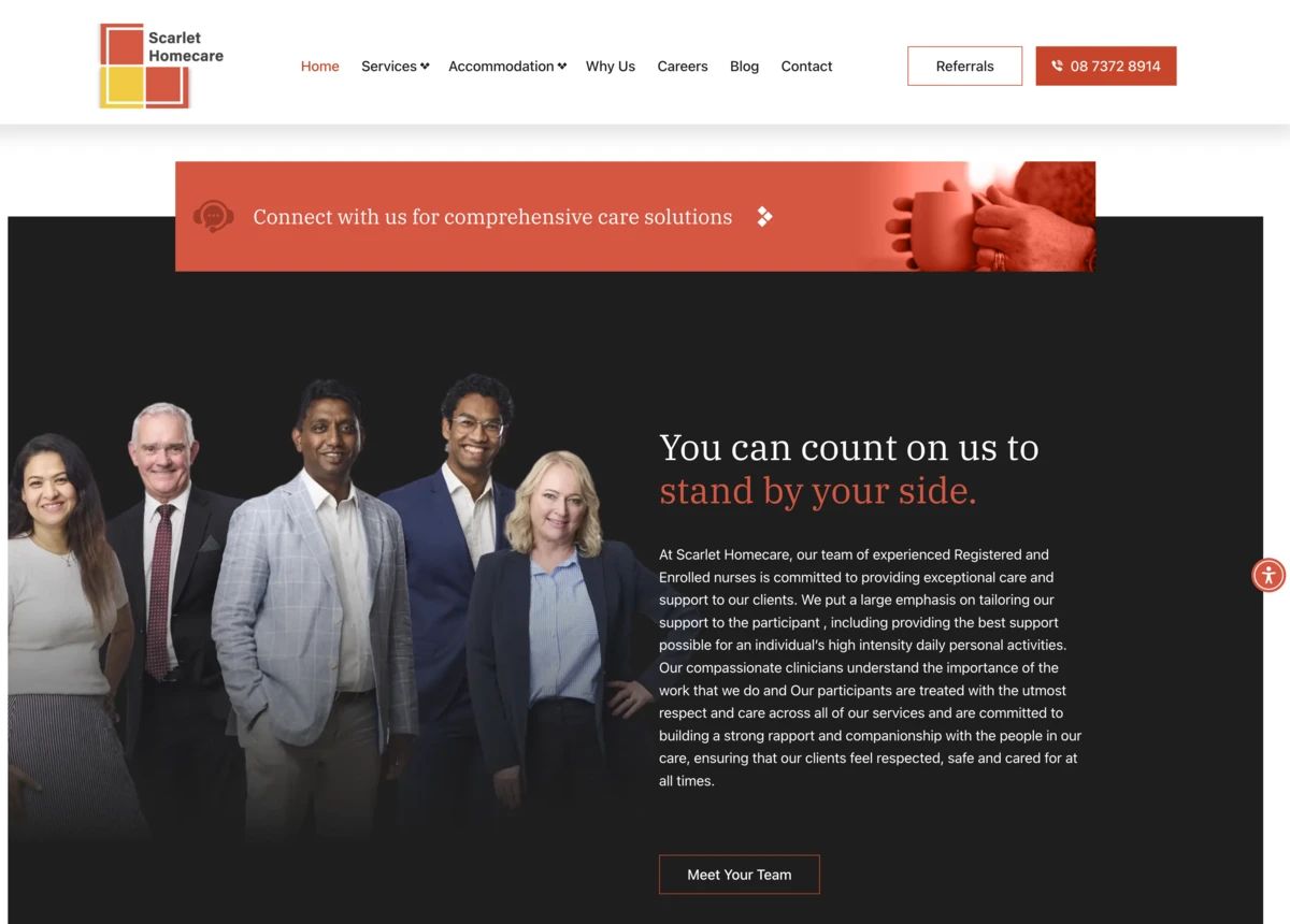 Full website rebuild for Scarlet Homecare, an NDIS provider. The new site improved conversions, added key functionality like referral forms and accommodation listings, and elevated the brand’s professional image.