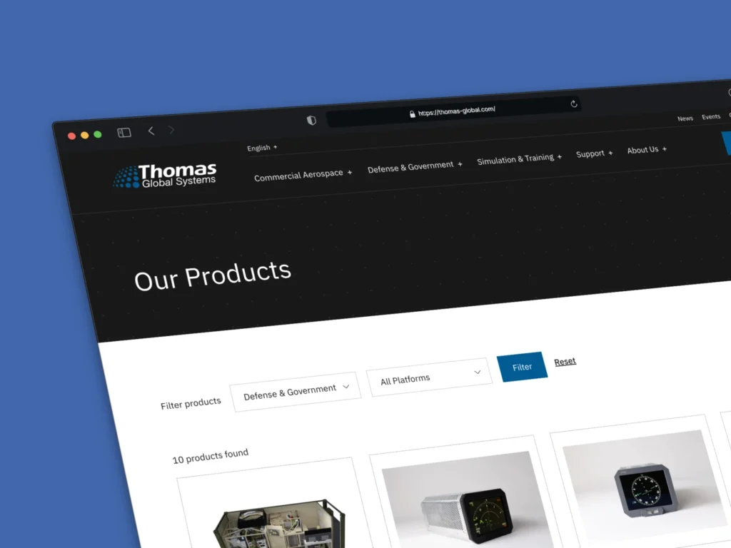 Following a recent rebrand, Thomas Global Systems’ existing website no longer reflected their updated visual identity or the scale and sophistication of their product offering. The site needed to present a large and technically complex product range in a way that was clear, engaging, and suitable for both desktop and in-person use at industry exhibitions. In addition, the team required a system that was easy to update internally while maintaining strict design consistency, performance, and SEO standards.